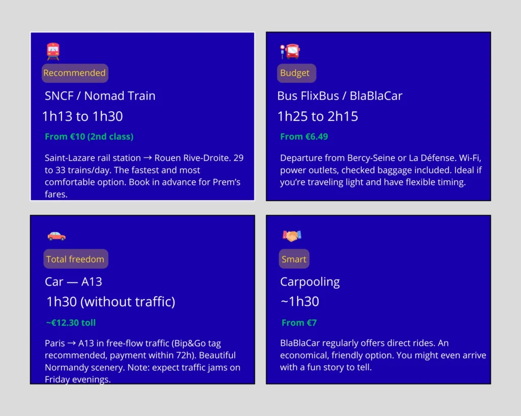 My tip for Sunday‑night drivers: absolutely avoid returning between 5 and 8 PM in the summer. The A12/A13 interchange near Rocquencourt and the Mantes‑la‑Jolie crossing regularly suffer spectacular jams. Take the train home. You’ll arrive fresh, rested, and with all your Rouen stories neatly stored in your head.
